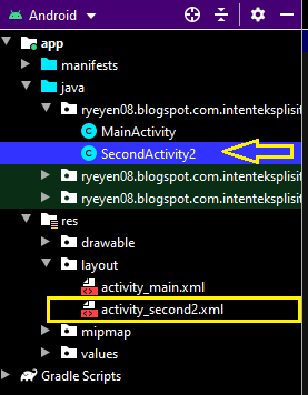 Package name → bisa default saja atau bisa juga diubah, disini saya menggunakan url blog saya lalu diikuti nama project IntentEksplisit